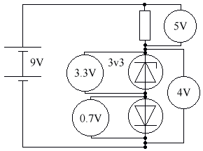 The Light Emitting Diode (LED) is made of a different material. Its forward voltage drop is 2v, & the maximum current is about 50 mA. It requires a series resistance to limit the current. The LED is generally used as an indicator, as it doesn't give off enough light to be used as a light source.
