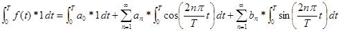 note:    the second and third integrals are zero since the area under a sine or cosine over a integer number of cycles is always zero.  They have equal areas above and below the axis.